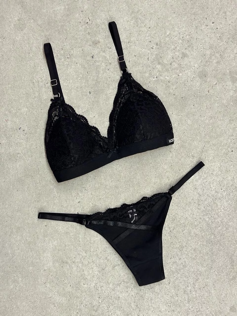 CONJUNTO ALGODÓN, LYCRA Y PUNTILLA. SOSTÉN TRIÁNGULO CON TAZA Y LESS REGULABLE.