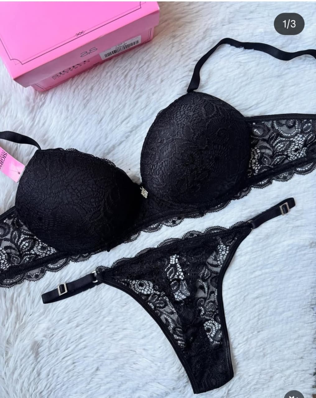 - CONJUNTO DE PUNTILLA. CORPIÑO PUSH UP SOFT CON DIJE ROMBOIDE STRASS. TANGALESS