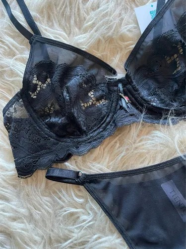 - Conjunto compuesto por soutien con arco en tul lycra y puntilla, que brinda soporte y realce natural con un diseño delicado,y elegante con transparencias sutiles. Incluye tangaless clásico en tul lycra con detalles de puntilla, logrando un calce cómodo y sensual.